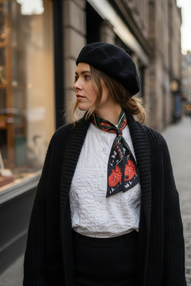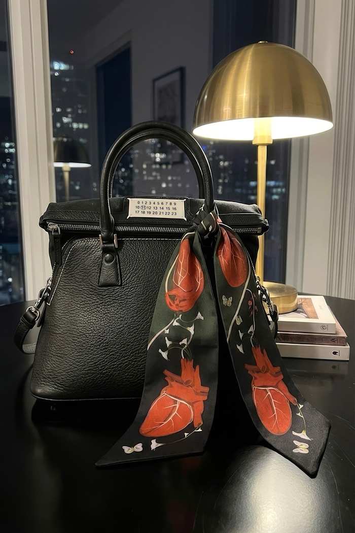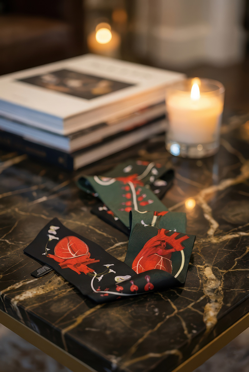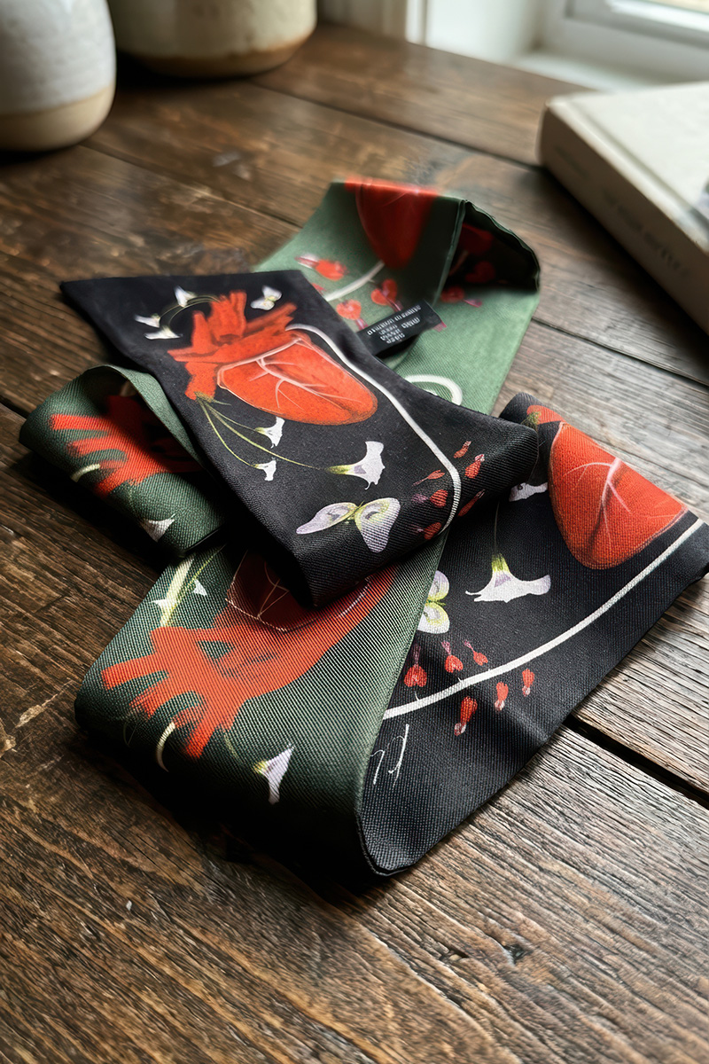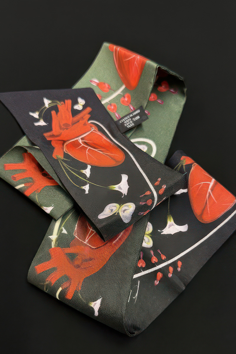 A beating heart brought to life in a chic, contemporary silk twilly. Created in collaboration with artist K. Chalaris, whose surreal, whimsical illustrations are transformed here into exquisite wearable art—an elevated expression of creativity and quiet luxury that subtly enriches your everyday world with art.